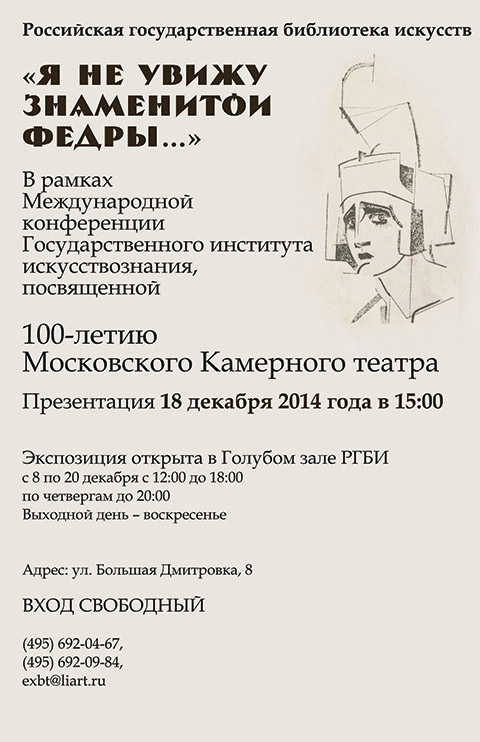 Российская государственная библиотека искусств (РГБИ) провела выставку «Я не увижу знаменитой Федры…». Трагическая история «театра эмоционально-насыщенных форм», как охарактеризовал его создатель и главный режиссер А.Я. Таиров, стала темой этой экспозиции.
